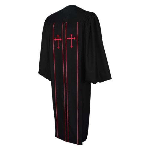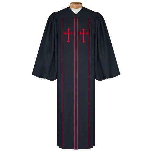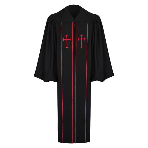 When there is a need for a festive and decorative pulpit robe for special church events and celebrations, one of the robes you can choose to wear is the Clerical Pulpit Robe in black. This rather decorative and unique looking robe comes with two front panels that have embroidered crosses and piping in red. This full length robe also has traditional bell sleeves, a V-neckline, flat front pleats, and hidden front zipper. The ruched yoke design in the back makes for a comfortable fit.